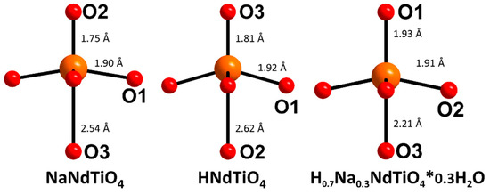 An interesting fact found in this research is a change in the nature of the titanium-oxygen octahedron distortion in the partially protonated phase. The latter is different from NaNdTiO4 and HNdTiO4 in weak elongation of the octahedra towards the ion-exchangeable interlayer space, which allows the Ti4+ cation to be nearly equidistant from both axial oxygen atoms (Figure 8).