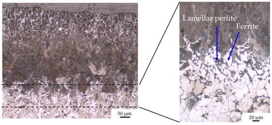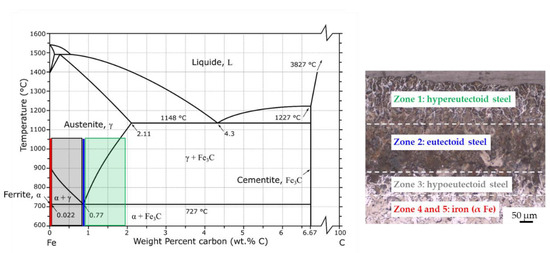 - zone 3: pearlite + ferrite (corresponding to hypoeutectoid steel);