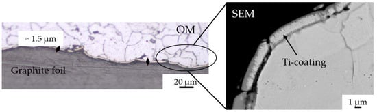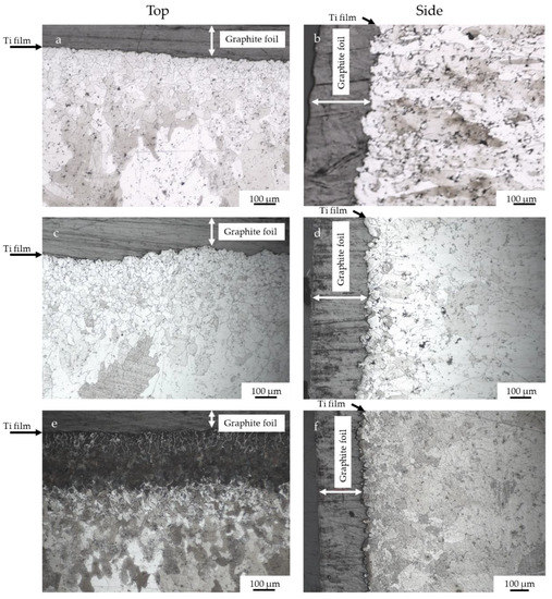 - The application of a Ti PVD film of 1.5 and 1.1 µm on graphite foils is effective to completely avoid carburization of iron powder (top, bottom and sides). Iron diffusion was revealed inside the Ti film of 1.5 µm thickness.