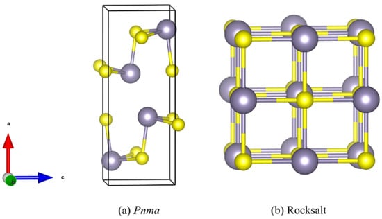 Electron exchange and correlation were described using the PBEsol generalised gradient approximation (GGA) functional [] with the DFT-D3 dispersion correction []. The ion cores were modelled using projector-augmented wave (PAW) pseudopotentials [,] with the Sn 5s, 5p, and 4d and the S 3s/3p and Se 4s/4p electrons treated as valence states. The valence wavefunctions were described using a plane wave basis with a 600 eV kinetic energy cutoff. The electronic Brillouin zones were sampled using -centred Monkhorst–Pack -point meshes [] with 4 × 8 × 8 subdivisions for the Pnma structures and 10 × 10 × 10/6 × 6 × 6 subdivisions for the rocksalt primitive/conventional cells. The electronic wavefunctions were optimised to a tolerance of 10 eV on the total energy.