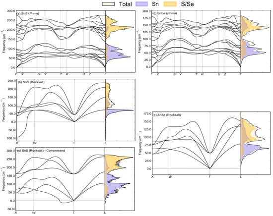 Calculated phonon dispersion and density of states (DoS) of Pnma SnS (a), equilibrium and compressed rocksalt SnS (b,c), Pnma SnSe (d), and rocksalt SnSe (e). On each DoS plot, the total DoS is shown in black and projections onto the Sn and S/Se atoms are shown as blue and orange shaded areas.