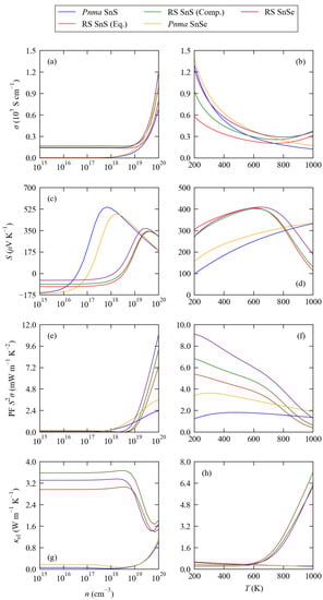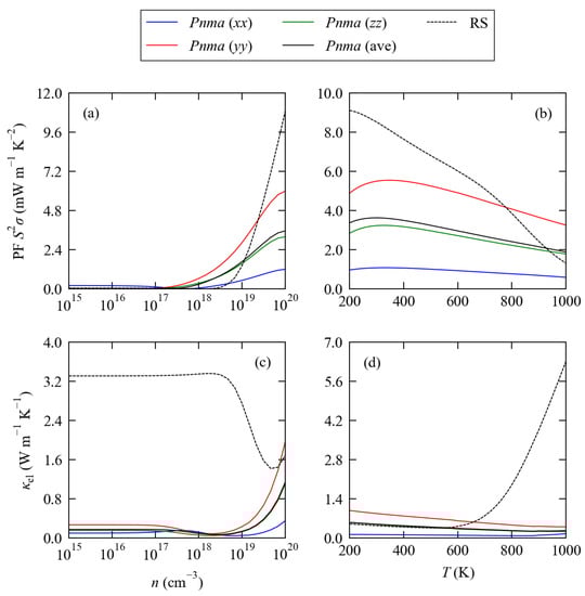 For undoped SnSe, typical n are on the order of 2 × 10 cm, and concentrations of up to 4 × 10 cm can be achieved with hole doping [,]. Our initial survey of the calculated properties clearly shows that n on the order of 10 cm and above are required to obtain a reasonable power factor, and, therefore, that doping is required to obtain good thermoelectric performance. At larger carrier concentrations, we predict the RS phase to support an up to 4 × larger PF than the Pnma phase, but this would be partially negated by a higher , which appears in the denominator of Equation (1).