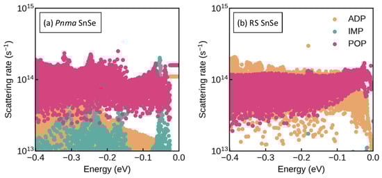 Calculated scattering rates as a function of energy for the electronic states in Pnma (a) and rocksalt SnSe (RS) (b) for a carrier concentration n = 2.15 × 10 cm and temperature T = 800 K. The energy zero is set to = . Rates are shown separately for the three scattering mechanisms relevant to the two phases of SnSe, viz. acoustic deformation potential (ADP), polar optic phonon (POP), and ionised impurity (IMP) scattering.