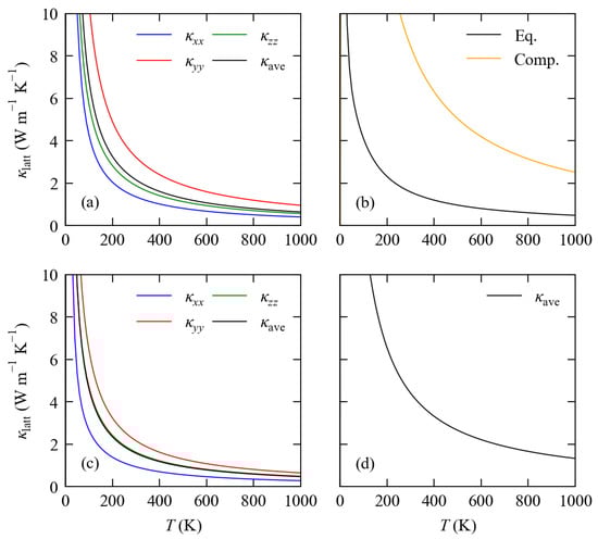 We previously demonstrated that the RTA model predicts lattice thermal conductivities for Pnma SnS and SnSe in reasonable agreement with experiments [], albeit with a tendency to overestimate as observed with the calculated electrical conductivities in Section 3.2. Figure 6 compares the temperature dependence of the of the five models examined in this study, and values at T = 800 K are listed in Table 2. As for the electrical transport properties, we considered the principal , , and components of the tensors of the two Pnma phases, corresponding to heat transport along the a, b, and c axes, respectively (cf. Figure 1), together with the scalar average calculated as: