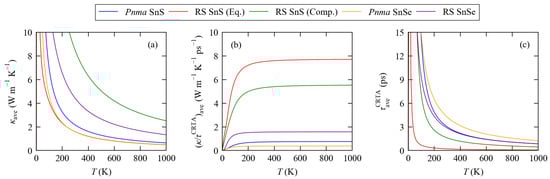 In general, the harmonic function saturates rapidly with temperature as tend to the Dulong–Petit limit, and the sharp decrease in with temperature primarily determines the temperature dependence of . As discussed in our previous study [], we found that the lower predicted of Pnma SnSe results from a balance of a smaller harmonic term and a longer lifetime. This CRTA analysis also provides insight into the anomalously small computed for the equilibrium RS SnS structure—for this structure, is predicted to be larger than for the compressed phase, while is predicted to be significantly smaller than for all the other systems including both Pnma phases. Since primarily reflects the differences in group velocities, which are given by the slope of the phonon dispersion, we attributed the former anomaly to the distortion of the band structure due to the presence of the imaginary mode (cf. Figure 2). The dynamical instability may also have the effect of increasing the third-order force constants, which could explain the extremely short . On the other hand, both the compressed RS SnS and RS SnSe structures show larger and shorter than the corresponding Pnma phases, highlighting a significant difference in the lattice dynamics of the two structure types.