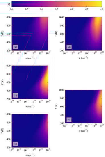 To compare the five structures, Figure 3 shows the three electrical properties , S, and as a function of carrier concentration at a fixed T = 800 K and as a function of temperature at a fixed n = 2.15 × 10 cm.