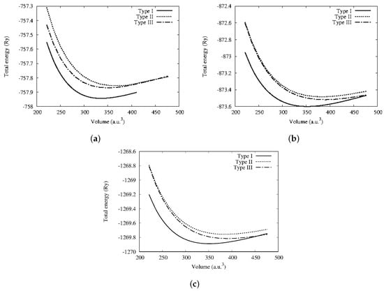 Calculated total energy as a function of volume in ferromagnetic state for the three possible structural phases (a) CoCrSb, (b) CoMoSb, and (c) CoWSb, respectively.