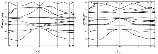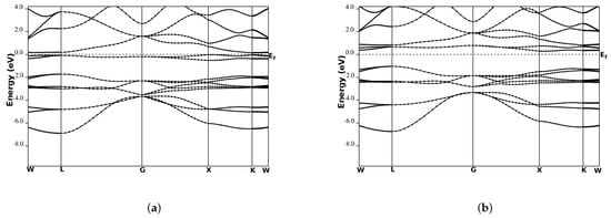 We performed the spin-polarized energy band structure calculations for structural phase Type-I in CoYSb (Y = Cr, Mo, W). This was carried out using the calculated equilibrium lattice constants as well as the high symmetry directions in the first Brillouin zone, as shown in Figure 3 and Figure 4. In both Figure 3 and Figure 4, the minority-spin (down) states lie within the semiconductor region and the majority (up) states in the metallic region. In Figure 3a and Figure 4a, the majority-spin channels energy bands exhibit metallic properties where orbitals overlap from the valence band to the conduction bands, whereas in the minority-spin, there is a gap separating the valence band from the conduction bands, as shown in Figure 3b and Figure 4b. These gaps in the minority spin revealed the half-metallic nature in CoCrSb and CoMoSb half-Heusler alloys. For CoCrSb alloy, the valence band maximum (VBM) occurs at the -point and the conduction band minimum (CBM) is located at the X-point, resulting in an energy band gap of 0.81 eV for this alloy. This band gap is in good agreement with the previously calculated value of 0.77 eV by Zhong-Yu et al. []. Meanwhile, for CoMoSb, minority-spin gaps become broader, and the Fermi level is pushed closer to the conduction bands of the minority-spin electrons. Here, the VBM is located at the L-point, and the CBM is at the X-point, which leads to an energy band gap of 0.32 eV, as presented in Figure 4b. This also indicates that CoMoSb is half-metallic since the alloy behaves like metal in the majority spin and shows semiconducting properties in the minority spin. We did not report on the metallic nature in CoWSb alloy because, at both majority and minority spin channels, the material has metallic properties.