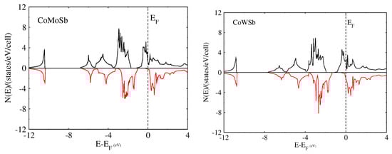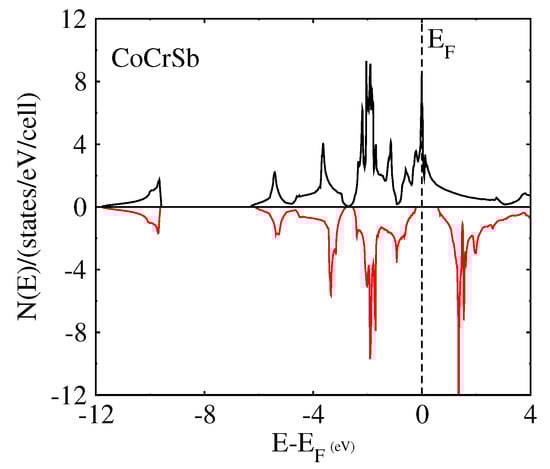 Using density functional theory, some Co-based HH compounds have been predicted to be semiconductor, metallic, and half-metallic materials. The half-metallic material is material that behave like a semiconductor in the minority spin, while in the majority spin, it has the metallic character, as first reported by de Groot et al. [] in 1983 for the NiMnSb alloy, which also depends on the valence electron counts (VEC) of the alloys [,,,,,,,]. Nanda and Dasgupta [] reported CoMoSb to be metallic from the series of HH compounds XMZ (X = Fe, Co, Ni: M = Ti, V, Nb, Zr, Cr, Mo, Mn and Z = Sb, Sn) they investigated. Zhong-Yu et al. [] studied the structural and electronic properties of CoCrZ (Z = Sb and Te) using the full-potential linearized augmented plane wave (FP-LAPW) method. They showed that CoCrSb is half-metallic and has a spin-minority gap.