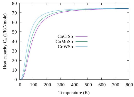 It can be seen from Figure 6 the trend of the specific heat toward the Dulong–Petit limit, which is the specific heat value independent of temperature. From this limit value of Dulong–Petit, as the temperature increases, each of the atoms in the material absorbs the same amount of energy proportional to the temperature increase. This value corresponds to 72.63 J/Nmol.K for CoCrSb and CoMoSb, respectively, while it reads 73.47 J/Nmol.K for CoWSb. The Debye temperature is a fundamental parameter of thermodynamic, which is linked with many physical properties of the material such as the melting temperature, lattice vibrations, and specific heat at low temperature []. These properties listed in Table 6 were obtained from the calculated elastic constants using the following equations