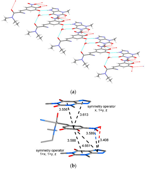 (a) Packing arrangement of entacapone, theophylline, and water molecules, showing the hydrogen bonding interactions as blue and red dashed lines. (b) Packing arrangement of entacapone and theophylline in the cocrystal with π-π interactions (in Å) as dashed lines between and to the ring centroids (hydrogen atoms omitted for clarity).