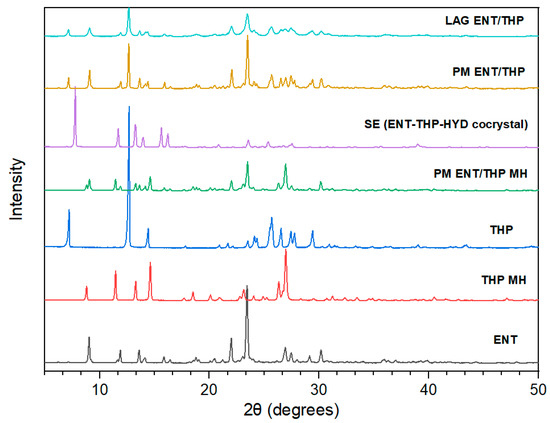 Solvent evaporation (SE) of equimolar methanol solutions of ENT and THP monohydrate provided the same X-ray diffractogram (Figure 2) as the reference cocrystals prepared by Bommaka et al., via liquid-assisted grinding (LAG) [31]. The experimental X-ray diffractogram was superimposed on the theoretically calculated patterns of the known crystal structure (CSD reference code XIPNOC) and all major reflections showed good agreement, with only minor shifts, confirming the existence of highly pure cocrystal in the sample obtained by SE (Figure S1, Supplementary Materials). It should be noted that in our experiments, attempts to produce the cocrystal by LAG were unsuccessful, possibly due to low environmental humidity. Therefore, physicochemical characterization of physical mixtures was also applied for a better monitoring of the cocrystal formation and purity upon production. Interestingly, the ENT-THP-water 1:1:1 cocrystal was also obtained using anhydrous THP as starting material upon SE in methanol at room temperature without environmental humidity control, while when the solvent was evaporated at 0% relative humidity (in P2O5–filled desiccators), no cocrystals were formed. The formation of the cocrystal from anhydrous components can be attributed to the moisture uptake from the atmosphere, which facilitates the nucleation and growth of the cocrystal [65], whereas the presence of equimolar quantity of water can be considered crucial for the formation of cocrystals between ENT and THP.