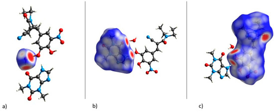 Hirshfeld Surfaces mapped over dnorm for (a) water molecule, (b) THP molecule, and (c) ENT molecule, in the ENT-THP-water 1:1:1 cocrystal.