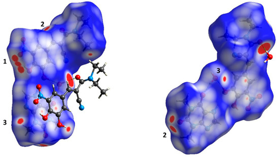 Hirshfeld surface (HS) analysis has become a valuable tool to elucidate the nature of intermolecular interactions affecting the molecular packing in cocrystals [74,75]. HS analysis can provide useful information about the detailed intermolecular interactions of the whole molecular system through color mapping (red and blue for high and low interaction intensities, respectively). The quantification of these intermolecular interactions can be performed with the aid of the corresponding 2D fingerprint plots, splitting them into specific atom···atom contacts. Figure 3 indicates the Hirshfeld surfaces mapped over dnorm function, where (a) represents the water molecule, (b) represents THP molecule, and (c) represents ENT molecule of the ENT-THP-water 1:1:1 cocrystal. The large deep-red spots, attributed to N-H···O and O-H···O intermolecular hydrogen bonds, are dominant for the stabilization of the primary cocrystal structure. Interestingly, the hydrogen-bonded intermolecular contact between ENT and water (O1-H1A···O8) is shown to be shorter (and stronger) than the ones with the THP, respectively. This is in accordance with the geometric parameters derived in literature [31]. For better identification of regions of interest, an overall view of HS mapped over dnorm of the cocrystal in different orientations is provided in Figure 4. The large deep-red spots are associated with the O-H···O (O8-H8A···O5) hydrogen bond between water and ENT molecule. These interactions constitute the driving force in the cocrystal packing with the water molecule to play a crucial role in the stabilization of the ladder structure of the cocrystal dimers. Except for the displayed contacts, the three diminutive red spots near the -NO2 group of ENT (1) are assigned to the intermolecular interactions of two ENT dimers, forming the sheet structure. Furthermore, the two red spots close to C=O group of THP (2) are assigned to two close contacts with an ENT molecule at the corresponding (2) site, while the intermolecular interaction (3) is attributed to a weak contact C-H···O between the THP and the water molecule. The white HS spots, displaying the contacts with lengths close to the sum of van der Waals radii, are due to π-π stacking interactions (C···C and C···N) of the molecules’ rings.