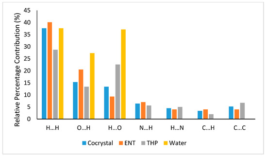 Figure 5 shows the overall 2D fingerprint plots of the cocrystal and its constituents, while Figure 6 displays the relative percentage contributions of most important close contacts to the overall Hirshfeld surface. The decomposed 2D fingerprint plots analysis assign the highest contribution at H···H intermolecular interactions that comprise the highest percentage of the total Hirshfeld surface. The role of the hydrogen atoms is essential in stabilizing the crystal packing of the cocrystal. The O···H/H···O intermolecular interactions that appear as narrow spikes in the fingerprint plots also display high contribution to the total Hirshfeld area and are the shortest and most likely the strongest intermolecular interactions within the cocrystal. THP shows slightly higher relative percentage contributions of conventional hydrogen bonding (O···H/H···O and N···H/H···N) than ENT, 46.6% vs 40.8%, respectively, while for the cocrystal the value is 39.6%. This indicates that for the primary cocrystal structure, hydrogen bonds between the components are dominant, while the supramolecular assembly of the cocrystal is also based on other short intermolecular contacts, in addition to hydrogen bonds. According to the analysis, the cocrystal is stabilized by π-π stacking interactions mainly due to the strong π-π interactions of THP ring. These π-π stacking interactions contribute with 5.2% to the total Hirshfeld surface of ENT-THP-water cocrystal. As all fingerprint plots are colored on the same relative scale, it can be stated that water forms the strongest intermolecular interactions within the cocrystal.
