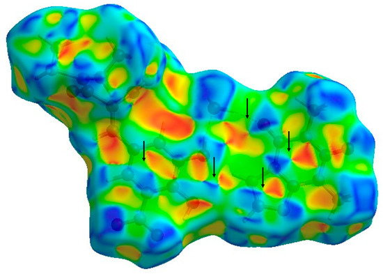 For a better estimation of the stacking interactions of the cocrystal, the HS was also plotted over the shape-index (Figure 7). Blue triangles represent the convex regions shaped by the ring carbon and nitrogen atoms of the molecules inside the surface, while red triangles show the concave regions formed due to the carbon and nitrogen atoms of π-stacked molecules above it. The adjacent red and blue triangles indicate the presence of π-π stacking interactions at great extent, where all the rings of the cocrystal participate (imidazole and pyrimidine ring of THP and benzene ring of ENT).