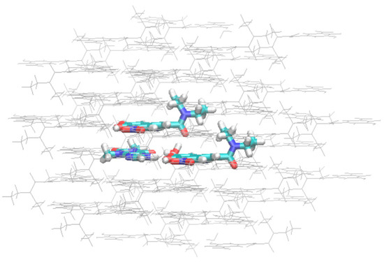 A Quantum Theory of Atoms in Molecules (QTAIM) analysis was carried out for the QM/MM optimized structure and the bond critical points (CPs) associated with the intermolecular interactions were identified (Figure 10). QTAIM analysis also demonstrated the extended π-π stacking interactions and the absence of any other π-based interaction, e.g., lone pair-π interactions, within the system. The sizable overlap of the aryl-plane areas in the cocrystal do not allow atoms with lone pair electrons, like the N atom of THP imidazole ring, to be aligned with a π-ring and participate in such interactions. A closer insight of the bond CPs corresponding to water interactions with the neighboring molecules in the cocrystal environment was obtained. In addition to the CPs corresponding to the hydrogen bond interactions colored in blue at NCI plots, another bond CP (C-H···O8) between water and ENT in the asymmetric unit was revealed. C-H···O interactions although weak are known to facilitate the crystal packing in cocrystals [79].