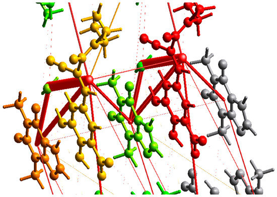 The second method employs a similar DFT intermolecular interaction energy calculation using B3LYP-D2/6-31G(d,p) molecular wave functions at the crystal geometry with the help of the CrystalExplorer v. 21.5 software program [51]. The “energy framework” is represented as cylinders connecting the molecules’ centers of mass, with their thickness being proportional to the intermolecular interaction energies [37].