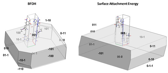 The morphology of the cocrystal was simulated based on the surface attachment energy (SAE) theory with the Oscail/Ritnos v. 5.4.7 software program [58]. A BFDH calculation provided a list of the most probable faces to appear in the final morphology, and subsequently, their surface attachment energies were calculated using Lifson and Hagler potential parameters [59] together with Mulliken atomic point charges, with the aid of Orca quantum chemistry code [49].
