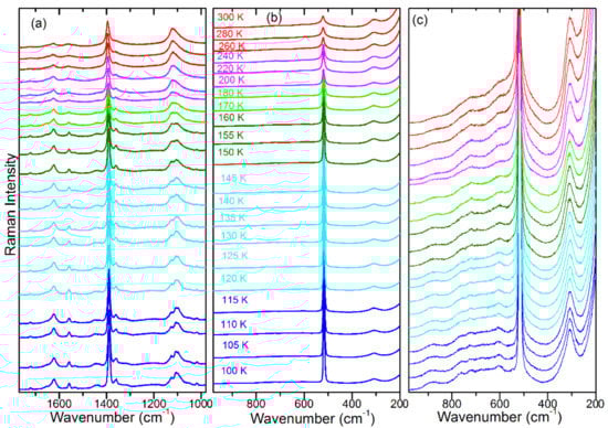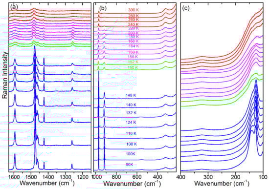 Temperature-dependent Raman spectra in the (a) 1630–1150 cm−1, (b) 1020–220 cm−1 and (c) 400–100 cm−1 range. Red, magenta, green and blue colours correspond to the , I4/mcm, P4/mmm (or Imma) and Pnma phases, respectively.