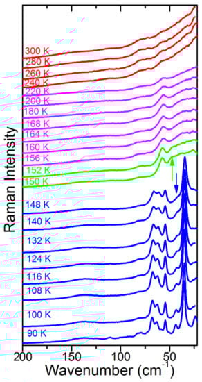On further cooling, the Raman spectra do not show any clear changes down to 156 K, except a narrowing of bands, which indicates a slowing down of molecular motions. Transition to a new phase becomes evident at 155 K. Firstly, the 971 cm−1 band shows a clear change of wavenumber slope vs. temperature (Figure 3a). Secondly, a new band appears at 47 cm−1 (Figure 2) and the 58 cm−1 band exhibits a sudden narrowing (Figure 2 and Figure 4b). However, the overall shape of the spectrum is very similar to that observed at 156 K. The Raman spectra indicate, therefore, that although the phase transition is associated with a further slowing down of the MA+ reorientational motions and a change in the tilts of PbBr6 octahedra, the structure of the new phase is very similar to that of the tetragonal phase I. In other words, we do not see any Raman evidence that could indicate a lowering of the crystal symmetry to Imma, as recently reported [26], i.e., the P4/mmm symmetry of this phase seems to be more likely.