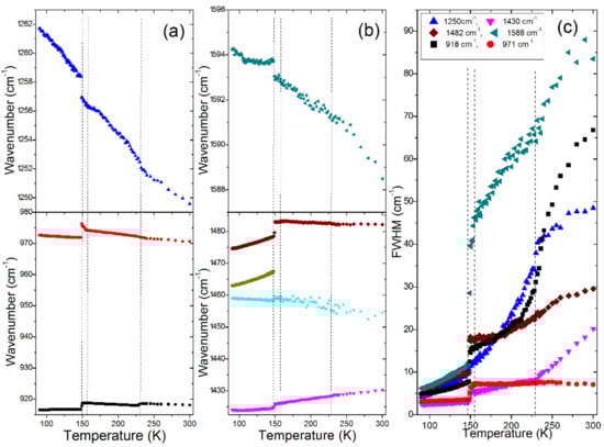 It is important to compare our results with the previous data reported in the literature for a single crystal [21] and a polycrystalline pellet [20]. Previous studies of Leguy et al. showed more internal modes than observed by Nakada et al. Since our spectra show the same bands as reported by Nakada et al., we suppose that some weak bands reported by Leguy et al. appeared due to impurities or surface defects. The temperature evolution of the 1482, 971 and 918 cm−1 modes is also in good agreement with that reported by Nakada et al. [20]. However, the very small temperature steps used in our experiment allowed for a much more precise observation of the changes induced by the phase transitions, especially in the narrow temperature range corresponding to the P4/mmm (or Immm) phase. Furthermore, we could also observe a large hardening and very pronounced narrowing of the 1588 cm−1 band on cooling the crystal, not clearly seen by Nakade et al., and monitor the temperature dependence of the 1250 and 1430 cm−1 modes, not reported in the literature.