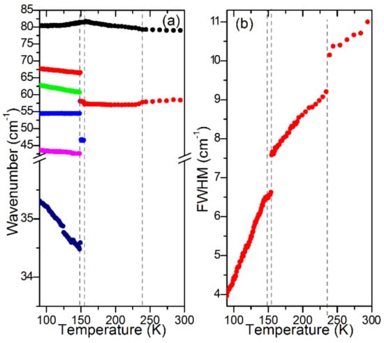 Plots of Raman (a) wavenumbers and (b) FWHM for lattice modes of a MAPbBr3 single crystal. The same color in (a,b) denotes data for the same Raman mode.