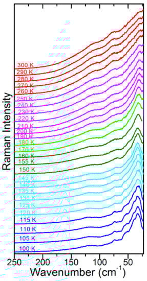 The temperature-dependent Raman spectra of a MAPbBr3 single crystal are presented in Figure 1 and Figure 2, whereas plots of the wavenumbers and full width at half-maximum (FWHM) values vs. temperature are presented in Figure 3 and Figure 4. The observed modes are listed in Table S1 together with the assignment based on previous Raman scattering studies of MAPbBr3 [20,21]. It should be noted that the mode near 322 cm−1 was assigned by Leguy et al. to the C–N torsion but we adopted here the assignment proposed by Nakada et al., i.e., we assigned this band to the MA-cage mode since this mode is not a pure torsion, as evidenced by the fact that it is strongly sensitive to the type of halogen anion [20]. The most intense modes, observed in the 35–81 cm−1 range at 90 K, can be assigned to octahedra twist and octahedra distortion (or alternatively to octahedra librations and Pb–Br bending modes). The remaining lattice modes, observed in the 90–141 cm−1 range, involve librational and translational modes of MA+ but since these modes couple to the cage modes [21], we assigned them to coupled L(MA+), T’(MA+) and Pb–Br stretching modes (Table S1). It is worth noting that the intensity of these lattice modes is at least one order of magnitude stronger that the intensity of the internal modes, confirming the contribution of Pb–Br vibrations to these modes.