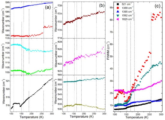 On further cooling, the Raman bands continue to narrow and shift to lower wavenumbers. However, near about 180 K, the 1122 and 1104 cm−1 modes change their behaviour, i.e., they start to harden on cooling (Figure 7a). The FWHM values do not show any discontinuities near 180 K but a clear change of the FWHM slope vs. temperature can be seen for the 1395 cm−1 mode (Figure 7c). No clear changes in the lattice modes region can be noticed (Figure 6). The Raman spectra indicate, therefore, that the inorganic sublattice is hardly affected and the phase transition is related to the change of FA+ dynamics. This conclusion is consistent with X-ray diffraction that could not reveal any decrease of the crystal symmetry, in spite of a very clear thermal anomaly.