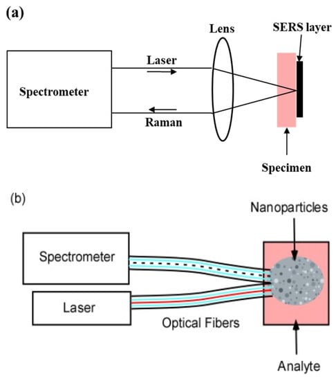 In vitro samples may be brought to a stationary instrument equipped with the SERS layer (Figure 1a). The layer may consist of a substrate on which pairs of conductors are separated by gaps as small as 2 to 4 nanometers. The conductors act as antennae for the incident light. They concentrate the electric field in the gaps and produce “hot spots” which enhance the Raman Effect [13,14,15]. Typically, the incident light is a laser beam which is focused by a microscope objective on a small area on the plate. The microscope objective performs several important functions: