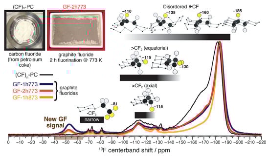 The fourth and final reason is simply because it is hard to achieve molecular-level characterization of fluorographite composites. Despite many examples of successful characterization by F MAS NMR in recent decades, sample spinning rates below 25 kHz were common until the early-2010s, obscuring possible isotropic F MAS NMR signal near −53 ppm due to overlap with spinning sidebands from and >CF groups. Even at our sample spinning rate of 33 kHz at a magnetic field of 9.4 T, sideband separation techniques using frequency swept pulses are crucial for obtaining the unambiguous sideband-free F MAS NMR spectra presented in Figure 1 [60,61]. At present, such experiments remain outside the conventional solid-state NMR repertoire.