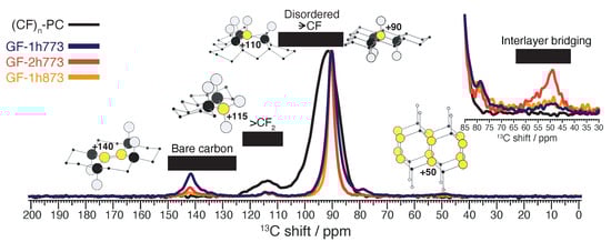 The C CP NMR signal near +141 ppm indicates sp hybridized bare carbon species within fluorinated domains. Such C species have been observed by C CP NMR near +141 ppm in partially unfluorinated covalent GFs synthesized from post-fluorinated F-GICs or graphitized carbon nanofibers [35,36]. Close inspection also shows a small C CP NMR signal at +79 ppm in the GFs, appearing near the base of the dominant covalent peak at +90 ppm. The intensity of the +79 ppm and +141 ppm features follow the trend GF-1h773 > GF-2h773 > GF-1h873, the same intensity trend observed for the −53 ppm GF F NMR signal, suggesting meaningful associations between them.