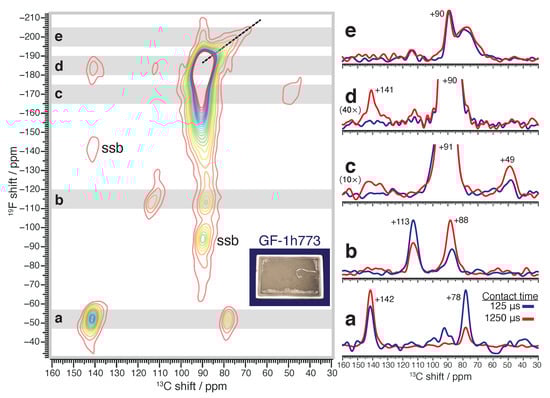 Solid-state 2D {F}C CP HETCOR CPMG MAS NMR spectrum of GF-1h773, acquired using a CP contact time of 1250 s. Contours drawn from 5.5 noise level up to 12.5% of the 2D signal maximum. Signal integrals over the shaded bands ‘a’ through ‘e’ shown on the 2D spectrum lead to the 1D C correlation profiles shown on the right, which include correlation profiles from a second CP HETCOR experiment at a shorter contact time of 125 s, scaled to the same maximum intensity as the long contact time profile. “)” indicates additional zoom to baseline by factor N. “ssb” = spinning sideband.