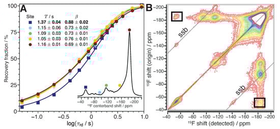 The absence of a significant (C,F) correlation signal near (+90,−53) ppm in the 2D CP HETCOR experiment along with the nearly exclusive association of bare carbon to the site associated with the −53 ppm F GF NMR signal suggests that these hyperconjugated groups are part of a distinct, generally fluorine deficient GF phase. To support this assessment, we analyzed F longitudinal () relaxation. Because F is an abundant nucleus with a relatively high magnetic dipole moment, F nuclei comprising the same material domain form a coupled network within which efficient spin diffusion occurs. This leads to approximately exponential longitudinal F relaxation with recovery parameters that in many circumstances are the same for each F site within the domain. Fluorine-19 nuclei that exist within another distinct and separate domain, however, commonly exhibit different relaxation properties compared to F within the first domain [43]. Consistent with this description, Figure 4A shows the recovery of F NMR signal after elimination of F Zeeman order by a saturation pulse train for different parts of the F NMR line shape. For the chemically distinct sites associated with the primary (CF) phase (circles), the signal recovery trajectories cluster together well. The extremely hyperconjugated site (squares), however, traces a distinctly different trajectory during the initial stages of relaxation when s, supporting its assignment to a distinct material phase.