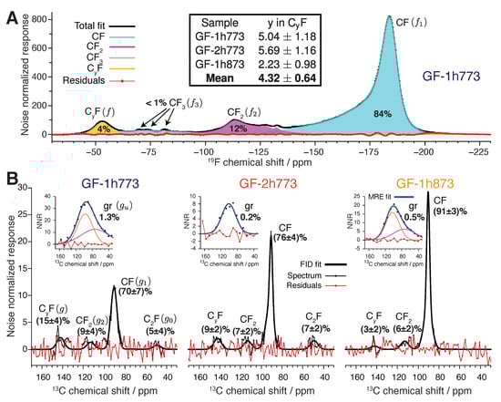 Quantitative analysis of NMR spectra. (A) Fit of 1D F centerband NMR spectrum of GF-1h773 into components assigned to CF (f), CF (), CF (), and CF () units. (B) Fit of quantitative 1D C MAS NMR spectra into components assigned to CF (g), CF (), CF (), bridging C (), and unfluorinated carbon (). The matched reconstructed CPMG echo (MRE) is analyzed jointly with the free induction decay (FID) NMR signal to determine the fraction. The table inset into panel (A) shows the values of y determined by the joint analysis of F and C spectra.
