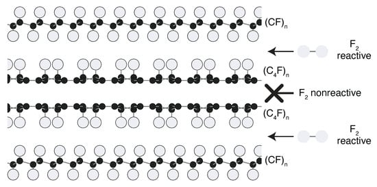 As Figure 4B reveals, the (CF) component of our samples is not isolated from the (CF) component. A structural model for graphite fluorides as a (CF)/(CF) composite is presented in Figure 7. This model is conceived as a consequence of kinetic limitations which prevent F molecules from fluorinating specific layers of the graphite source material during the high temperature fluorination reaction. The resultant covalent intercalation is intermediate between stage-1 and stage-2. This may occur when structural factors such as covalent C–C bridging between layers restricts penetration of F into the graphite galleries, or when specific galleries are free of sites promoting the dissociation of F into neutral atomic F, the species reportedly involved in activated complex formation with graphite during the direct fluorination process [53].