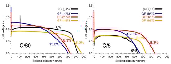 When the cells are discharged sixteen times faster, at C/5 (Figure 8, right), the GF materials become preferable to (CF)-PC in most respects. The (CF)-PC reference cell suffers by far the greatest voltage and capacity retention penalties upon going from C/80 to C/5 ( V, mA·h/g), indicating that the GF cells are relatively resilient at faster discharge rates. This resilience may be attributed to lower electrical resistivity of (CF) and its unsaturated carbon framework compared to (CF) [54]; this is exemplified best by the GF-2h773 cell, whose gravimetric energy density at C/5 was 1796 W·h/kg, 56% greater than that of the cell made from the “battery-grade” (CF)-PC reference material at C/5, just 1150 W·h/kg.