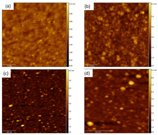 AFM images of the films on silicon, deposited at 200 °C (a), at 300 °C (c) and the same ones after a 1 h annealing in H2S atmosphere at 400 °C ((b,d) respectively).