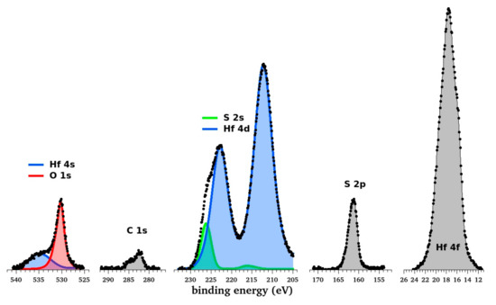 The binding energy of observed XPS peaks was determined by using the adventitious carbon peak at 284.6 eV as a reference. The following XPS peaks were measured (listed with binding energies): O 1s—532 eV, C 1s—285 eV, Hf 4d 3/2 and 5/2—211 eV and 221 eV, S 2p—164 eV, S 2s—229 eV, Si 2p—99 eV, Hf 4f—15 eV