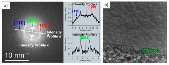 The structure of the layers was further explored with TEM measurements (see Figure 6 and Figure 7). The FFT analysis of the film deposited at 300 °C and annealed at 400 °C can be seen in Figure 6a. The annealed layer consists of crystalline 2D HfS2 films stacked upon each other with an average distance of 0.59 nm between them. This distance is in good agreement with the lattice distance of HfS2 (001). The (001) planes of HfS2 are, on average, parallel to the surface of the substrate, but this is only true with a very heavy grip. This strong scattering is shown by the smeared (001) peak in Figure 6b and the corrugated HfS2 layers in Figure 6a. Most of the layer is crystalline, but due to the wavy and intermittent HfS2 layers, it is difficult to rule out the presence of an amorphous phase between the sections of the HfS2 layers. A few nm amorphous layers can be observed on the surface of the deposited layers. This amorphization is due to the oxidation based on the EDS investigations in Figure 7. As can also be seen from the elemental mapping (Figure 7), the layers contain some oxygen, though mostly in the surface areas. The measurement showed no crystalline HfO2 present. The minor oxygen contamination is mostly present at the surface.