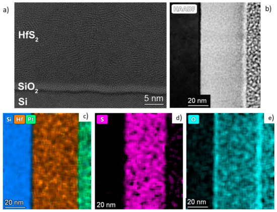 HRTEM images of the HfS2 film deposited on Si at 300 °C, annealed at 400 °C (a), the high angle annular dark-field image (b) of the same layer and the elemental distribution of Hf (c), S (d), and O (e).