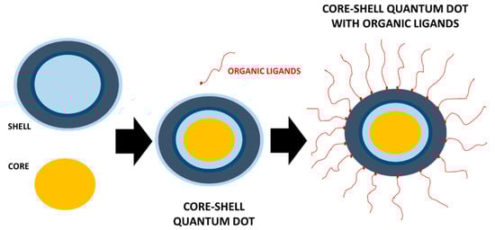 Schematic illustration of a shell-core quantum dot (QD) with organic ligands covalently attached to the shell.