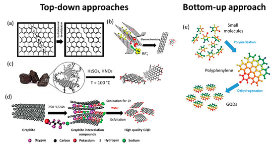 Fabrication of GQDs by top-down approaches: (a) hydrothermal deoxidization; (b) electrochemical exfoliation; (c) acid etching; (d) ultrasonic exfoliation; and a bottom-up approach: (e) carbonization route. Reprinted with permission [29].