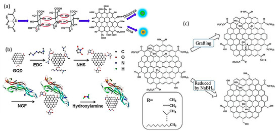 Scheme of functionalization synthesis of 2DQDs. (a) Growth mechanism of N doped GQDs (N:GQDs) and S,N co-doped GQDs (S,N:GQDS) by using citric acid (CA) as carbon source and urea and thiourea as N ang S sources. Reprinted with permission from [76]. (b) Route for conjugation of GQDs with a protein or peptide using nerve growth factor (NGF) as example. Reprinted with permission from [79]. (c) Surface modification of GQDs (grafting): alkylamines groups connected QDs structure, resulting blue luminescence m-GQDs, and reduction using NaBH4 to obtain blue luminescent r-GQDs. Reprinted with permission from [15].