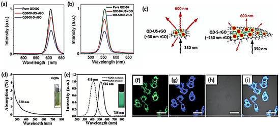 Fluorescence spectra of pure, small (S-rGO) and ultra-small (US-rGO) reduced graphene oxide quantum dots emitting at (a) 600 nm, and (b) at 550 nm. (c) Schematic for the surface adsorption of graphene oxide using an amphiphilic polypeptide (poly(L-lysine)) with the correspondent adsorption and conjugation. Reprinted with permission [47]. (d) UV-Vis absorption (UV-Vis ABS) spectra of graphene quantum dots (GQDs)—inset image: photograph taken under visible light. (e) Optimal excitation and emission PL spectra of GQDs—inset image: photograph taken under 365 nm UV light Reprinted with permission and adapted. [15]. (f) Confocal laser scanning microscopy image (CLSM) of HeLa living cells stained with 0.001 mg/mL of lysotracker for 20 min for MoS2/WS2 quantum dots. (g) CLSM image of HeLa living cells incubated in DMEM (Dulbecco’s modified eagle medium) containing 50 μ/mL. (h) The corresponding bright field image and (i) overlapped image of the living cells. All scales are 40 μm. Reprinted with permission and adapted [16].
