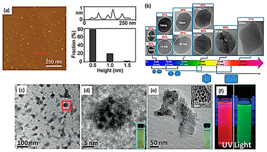 Images of 2DQDs obtained by AFM, TEM and HR-TEM characterization techniques. (a) AFM image, height profile and height distribution of GQDs. Reprinted with permission from [37]. (b) HR-TEM images of GQD for different shapes and corresponding populations with increasing their average size. The dashed lines indicate the size dimension of GQDs. Reprinted with permission from [36] Copyright © 2012, American Chemical Society. (c) TEM image of reduced graphene oxide quantum dots (rGOQDs). (d) HR-TEM image of the area shown in Figure 7c. (e) TEM image of rGOQDs with a higher resolution image of an area un the upper right inset. The insets at the lower right of Figure 7d,e show the sample suspension under visible light. (f) Suspension of rGOQDs under UV light exposure. Reprinted with permission from [47].