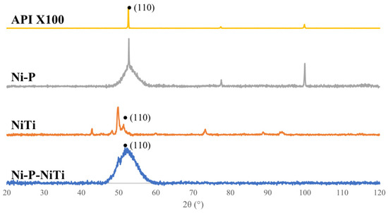 X-ray diffraction patterns of the API X100 substrate, NiTi nano-particle powder, monolithic Ni-P coating, and Ni-P-NiTi composite coating are shown in Figure 1. The Ni-P XRD pattern shows mostly an amorphous structure, but the pattern had a broad peak that covered the 52° to 56° 2θ, which was a close match to a nickel phosphide PDF (PDF 04-003-6331). Both Fe and NiTi are cubic structures that would diffract at the 110 plane, which happens around 45–55°. This very clearly is present in the API X100 pattern, which has a high intensity peak at 52°. The NiTi powder matches a nickel-titanium powder diffraction file (PDF ID: 04-020-1330 [27]) that has a peak at 49.8° from the 110 plane. This crystal structure is documented to have a weight percent ratio of 54.08Ni:45.92Ti. The Ni-P-NiTi coating resembles the Ni-P broad peak that extended from 52° to 55° and includes a visible smaller 49.8° peak which reflects what was seen in the powder’s pattern.