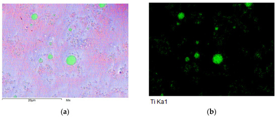 The cross-sections of the composite coatings showed a relatively even distribution of particles. An example of the composite coating cross-sectional EDS analysis is shown as an EDS map in Figure 2. Both Figure 2a,b show the same area of the cross-section of thick Ni-P-NiTi composite coating. Figure 2a shows multiple elements as different colors, where nickel is in blue, phosphorus is in red, and titanium is in green. Figure 2b shows only the placement of the element titanium, where the green dots represent the titanium particles. Table 3 shows the averaged chemical compositions in each type of coating found from the EDS Analysis.