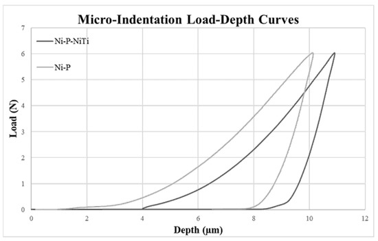 Figure 3 shows representative examples of the load-depth curves using point 5 on the Ni-P coating and point 4 on the Ni-P-NiTi coating.