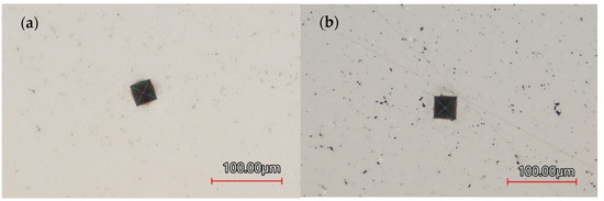 Figure 4 shows Vickers measurement points on the monolithic coating compared to the composite. Figure 4a is a point on the monolithic Ni-P coating and shows how the indent has a smaller width than the indent in the Ni-P-NiTi composite coating shown in Figure 4b. This is what was implied by the difference in hardness, elastic modulus, and indentation depth between the two coating types.
